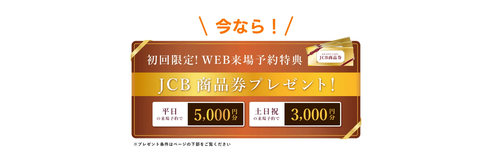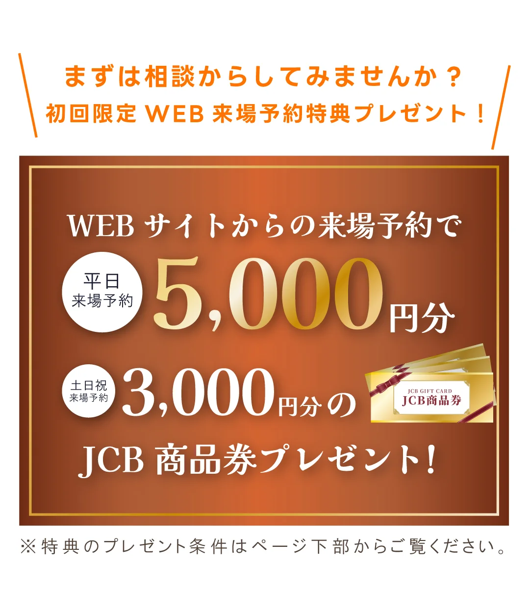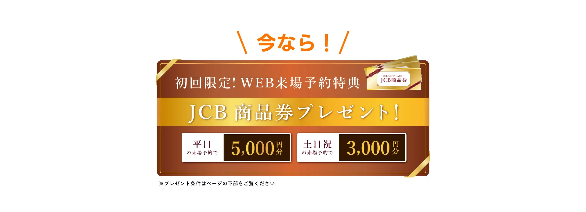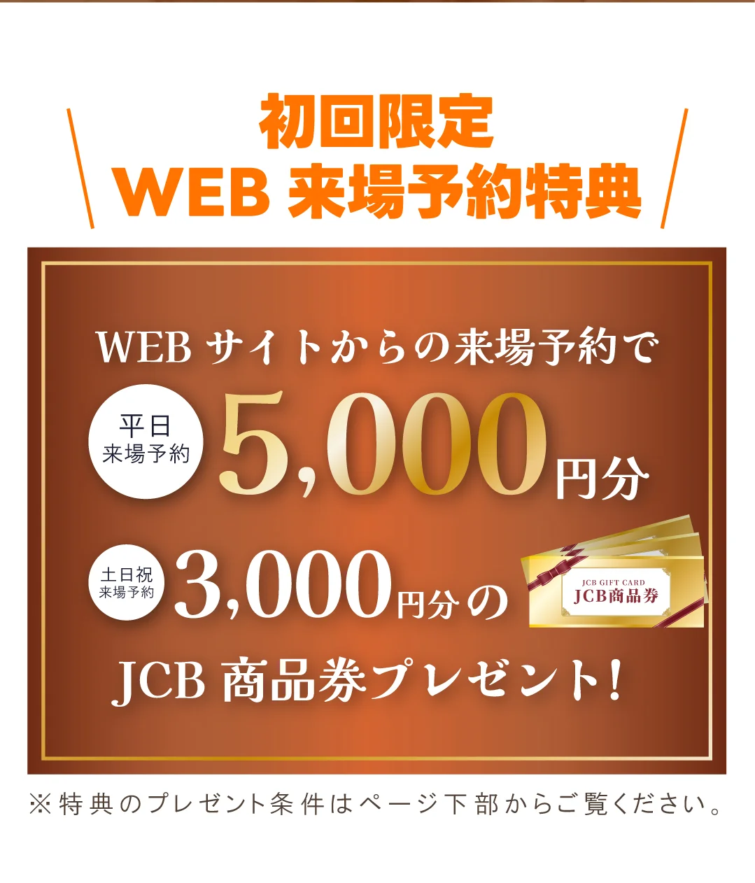 - WEB予約していただくと確認の連絡を取らさせていただきます。確認が取れた時点でWEB予約完了となり、ご来場特典の対象となります。
